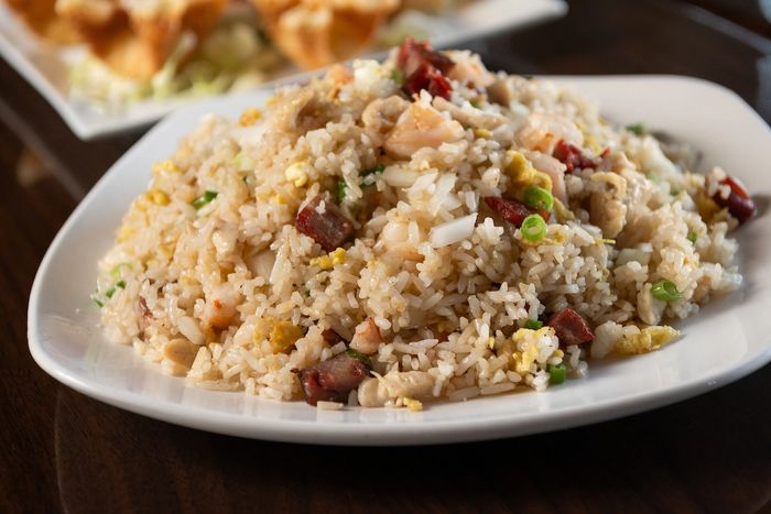 Stir fried rice with egg, Chinese BBQ pork, chicken, shrimp, onion and scallions